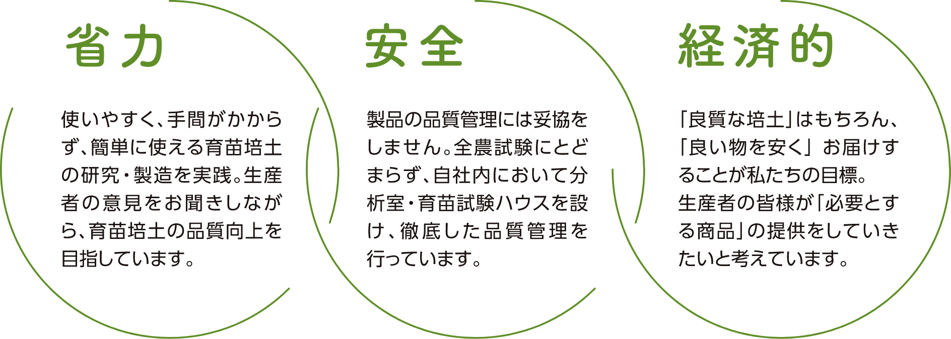 「良質な培土」はもちろん、「良い物を安く」 お届けすることが私たちの目標。生産者の皆様が「必要とする商品」の提供をしていきたいと考えています。